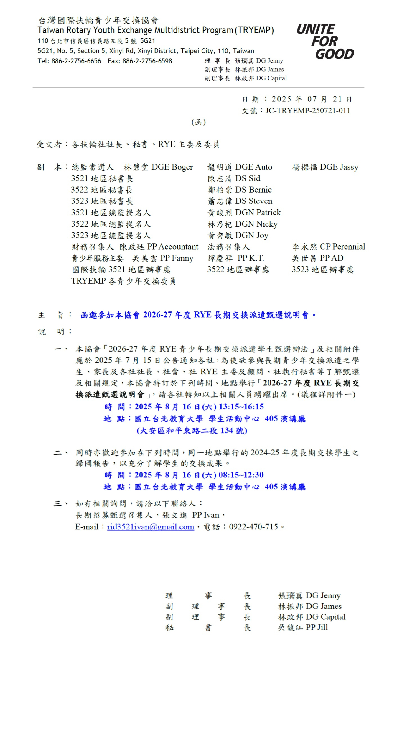 JC-TRYEMP-250721-011 函邀參加本協會2026-27年度RYE長期交換派遣甄選說明會。