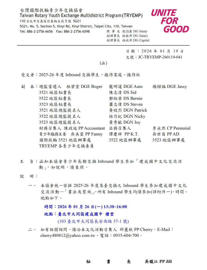 JC-TRYEMP-260119-041 函知本協會青少年長期交換Inbound學生參加「建成國中文化交流活動」,如說明,請查照。2026年1月29日 /wp-content/uploads/2024/12/TRYEMP_rye.png 0 0 yep /wp-content/uploads/2024/12/TRYEMP_rye.png yep2026-01-29 11:00:352026-01-29 11:00:35JC-TRYEMP-260119-041 函知本協會青少年長期交換Inbound學生參加「建成國中文化交流活動」,如說明,請查照。