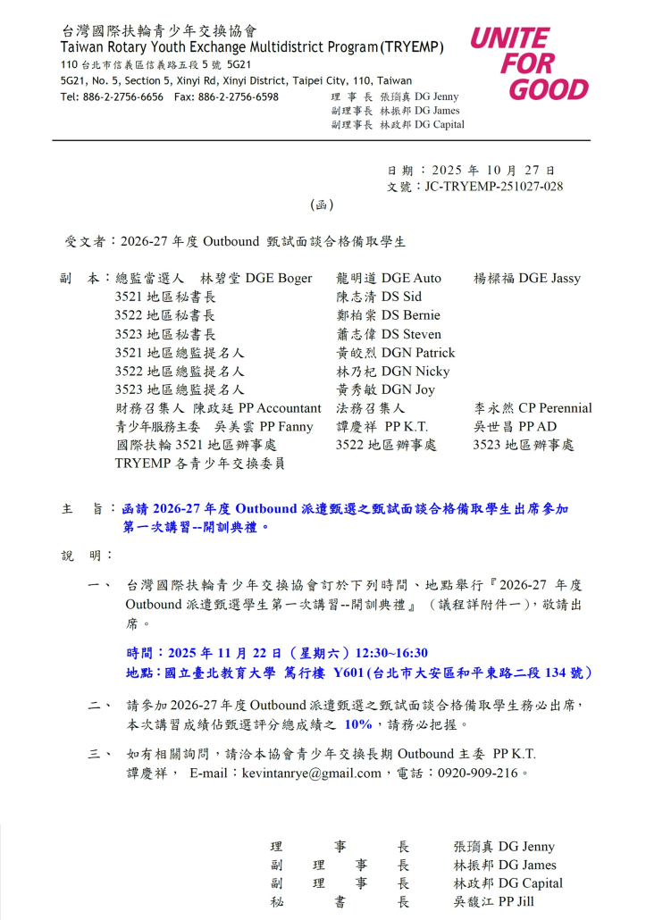 【TRYEMP公文】函請2026-27年度Outbound派遣甄選之甄試面談備取學生出席參加第一次講習–開訓典禮2025年10月27日/在: 公文, 長期Outbound 函請2026-27年度Outbound派遣甄選之甄試面談備取學生出席參加第一次講習–開訓典禮 https://www.tryemp.org/wp-content/uploads/2024/07/TRYEMP-LOGO.jpg 871 1050 rye /wp-content/uploads/2024/12/TRYEMP_rye.png rye2025-10-27 17:08:492025-10-27 17:08:49【TRYEMP公文】函請2026-27年度Outbound派遣甄選之甄試面談備取學生出席參加第一次講習–開訓典禮