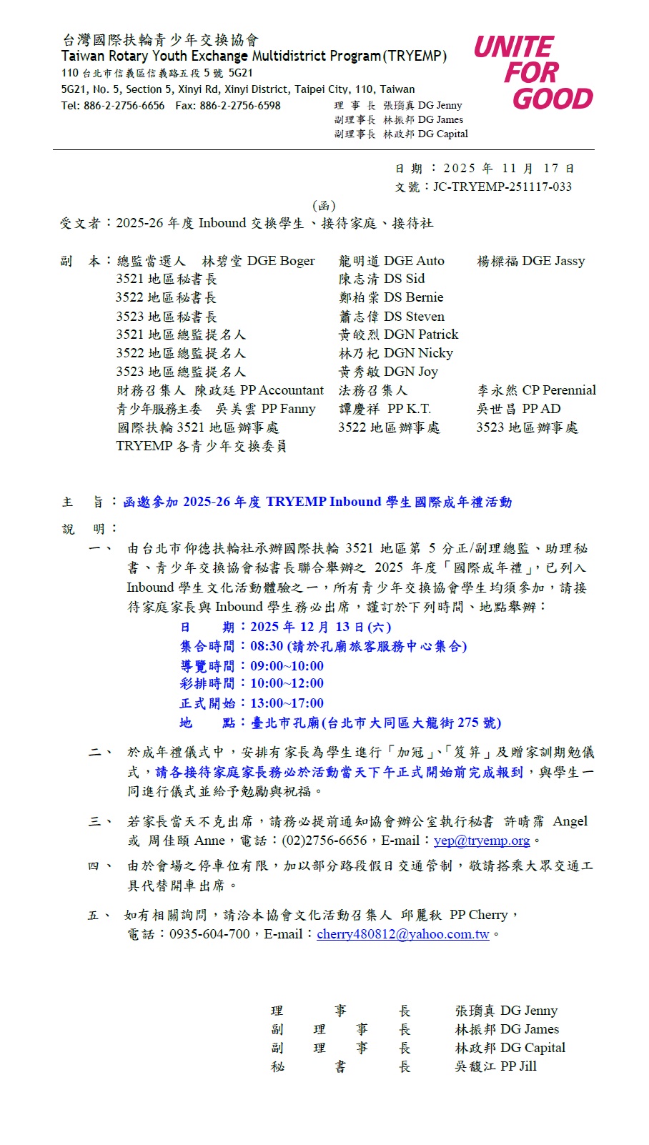 【TRYEMP公文】函邀參加2025-26年度TRYEMP Inbound學生國際成年禮活動2025年11月17日/在: 公文, 活動, 長期Inbound 函邀參加2025-26年度TRYEMP Inbound學生國際成年禮活動 https://www.tryemp.org/wp-content/uploads/2024/07/TRYEMP-LOGO.jpg 871 1050 yep /wp-content/uploads/2024/12/TRYEMP_rye.png yep2025-11-17 16:21:372025-11-17 16:21:37【TRYEMP公文】函邀參加2025-26年度TRYEMP Inbound學生國際成年禮活動