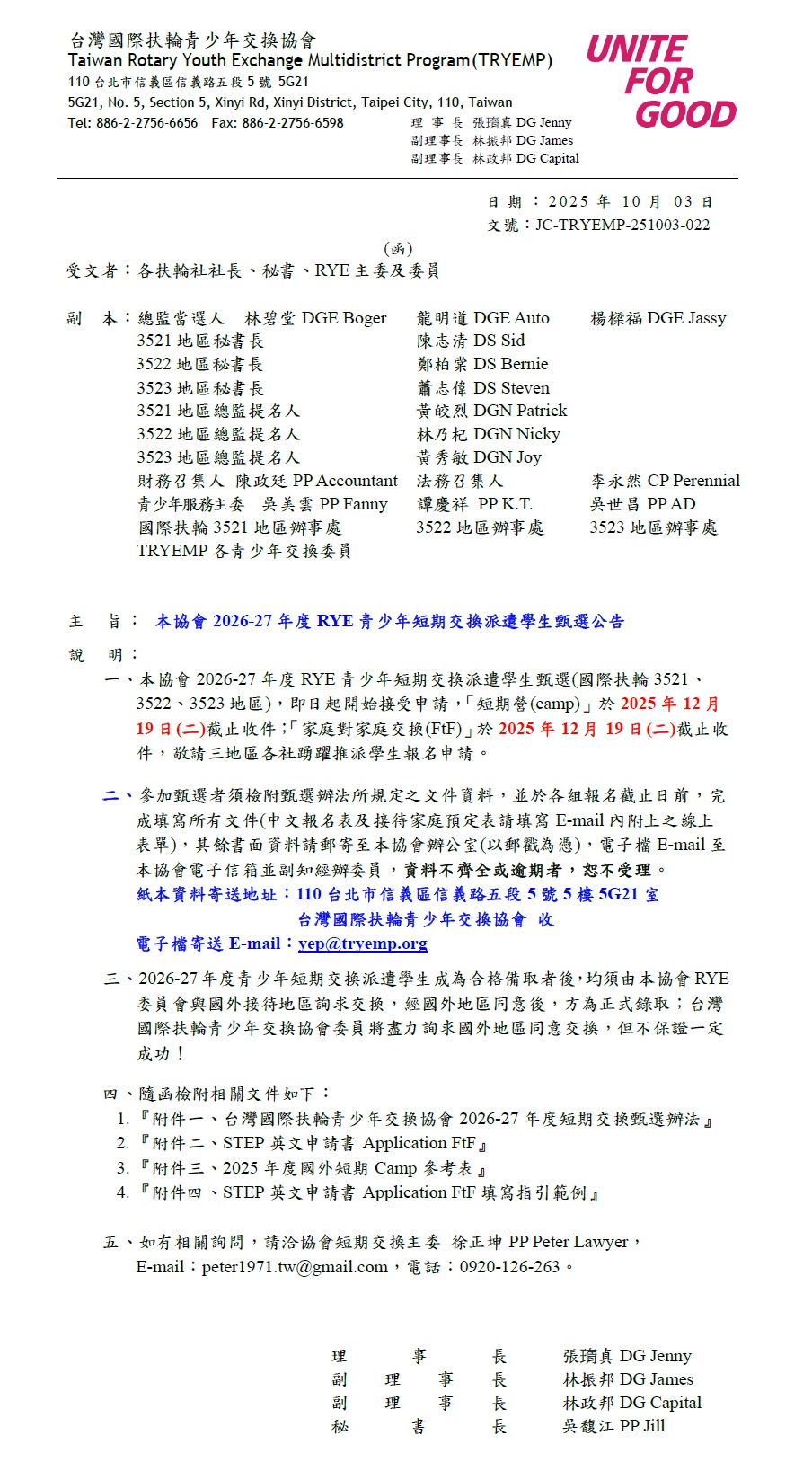 【TRYEMP公文】本協會2026-27年度RYE青少年短期交換派遣學生甄選公告2025年10月3日/在: 公文, 國外營隊Outbound Camp, 短期活動 本協會2026-27年度RYE青少年短期交換派遣學生甄選公告 https://www.tryemp.org/wp-content/uploads/2024/07/TRYEMP-LOGO.jpg 871 1050 yep /wp-content/uploads/2024/12/TRYEMP_rye.png yep2025-10-03 18:08:232025-10-03 18:08:23【TRYEMP公文】本協會2026-27年度RYE青少年短期交換派遣學生甄選公告
